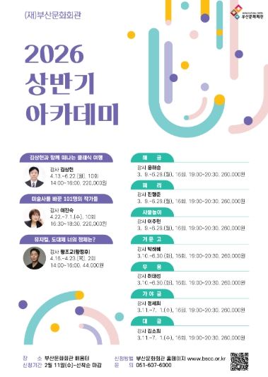 (재)부산문화회관은 오는 3월 9일부터 7월 1일까지 2026년도 상반기 정규 아카데미 강좌를 개설한다.