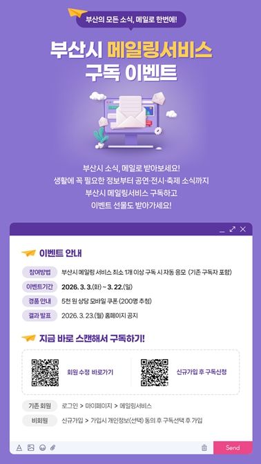 부산시는 시민들이 주요 시정 소식과 생활 정보를 보다 신속하고 편리하게 받아볼 수 있도록 오는 3월 3일부터 3월 22일까지 '부산시 소식, 메일로 한 번에(메일링 서비스 구독 이벤트)'를 추진한다고 밝혔다.